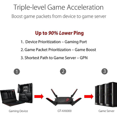 GT-AX6000 boosts your gaming traffic every step of the way; from your PC all the way to the game server. The exclusive triple-level game acceleration stabilizes your connections to prevent jitter; reduce lag; lower ping and increase speed for amazing gaming experiences.