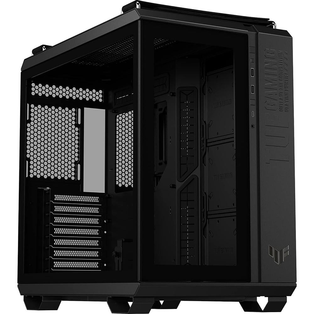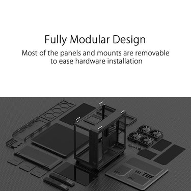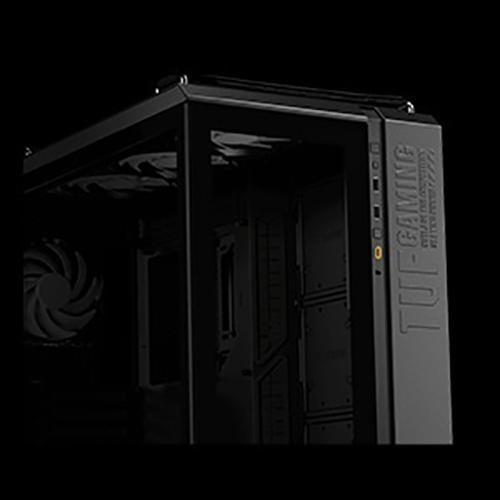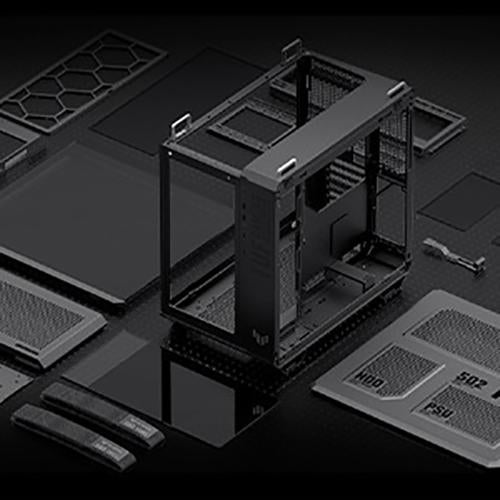The TUF Gaming GT502 continues its builder optimizations with side panels that can be removed simply by pressing a button hidden on the rear of the chassis.