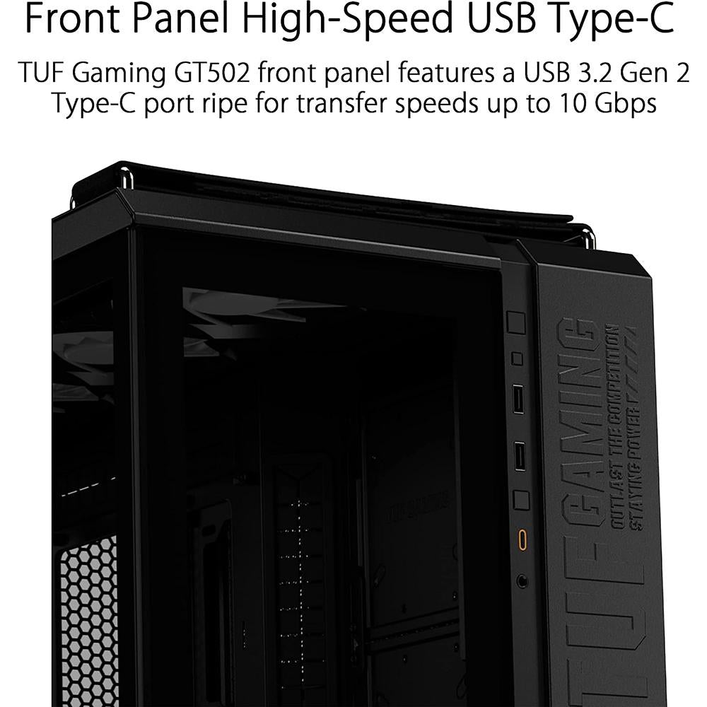 In addition to two USB-A ports; the TUF Gaming GT502 front panel features a USB 3.2 Gen 2 Type-C port ripe for transfer speeds up to 10 Gbps.