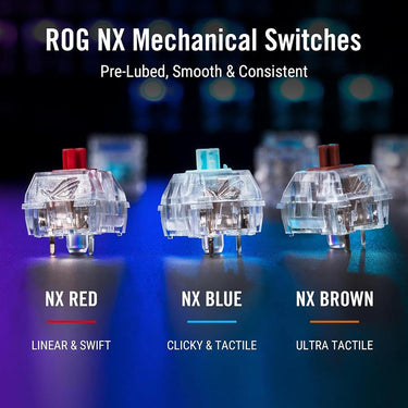 - Hot-swappable ROG NX mechanical switches - Pre-lubed switches for smoother clicks and eliminates bouncing noises respectively; fast actuation and ROG-tuned force curves provide great keystroke feel and consistency