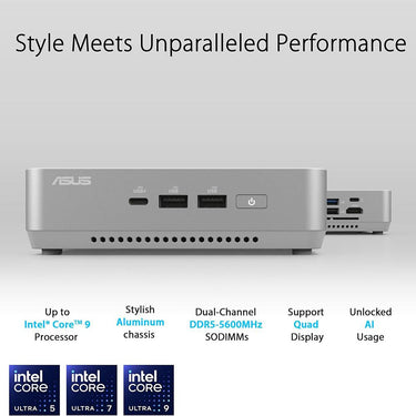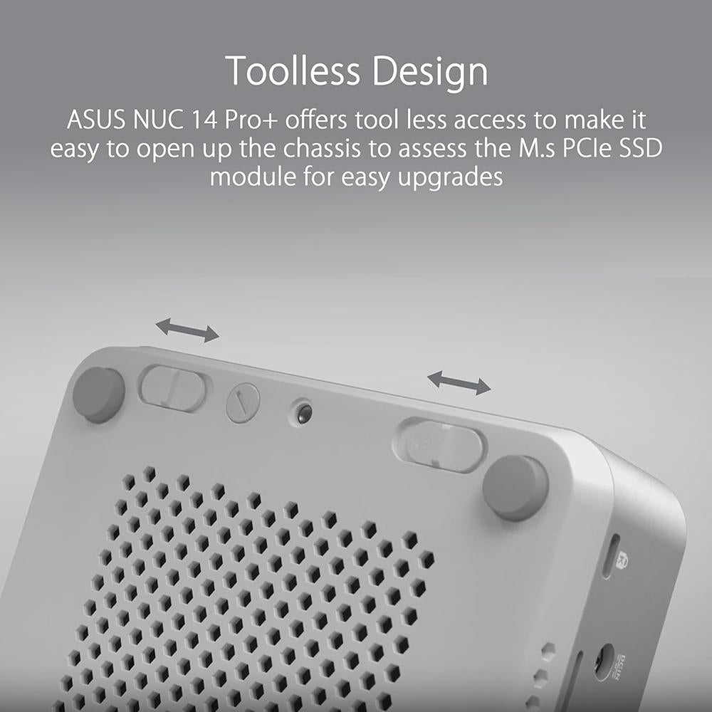 - ASUS NUC 14 Pro+ Barebone Kit with Intel 14th Gen Core Ultra 5 125H, Dual channel DDR5 RAM, Dual Storage Design, Thunderbolt 4, Wi-Fi 6E & Bluetooth 5.3, Silver Aluminum Chassis, Toolless Chassis Access, VESA Mount included