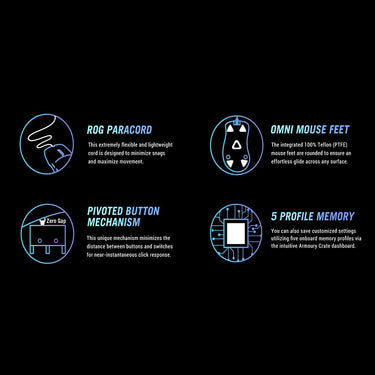 - ROG Paracord cable and 100% PTFE rounded-edge mouse feet ensure a swift and smooth glide