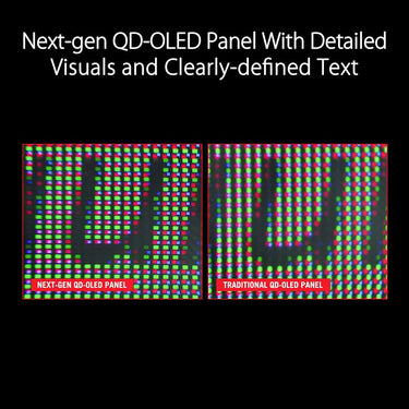 ROG Swift OLED PG49WCD features the latest generation QD-OLED panels. The sub-pixel layout provides clearer; more detailed visuals and crisper text to upgrade your viewing experience.