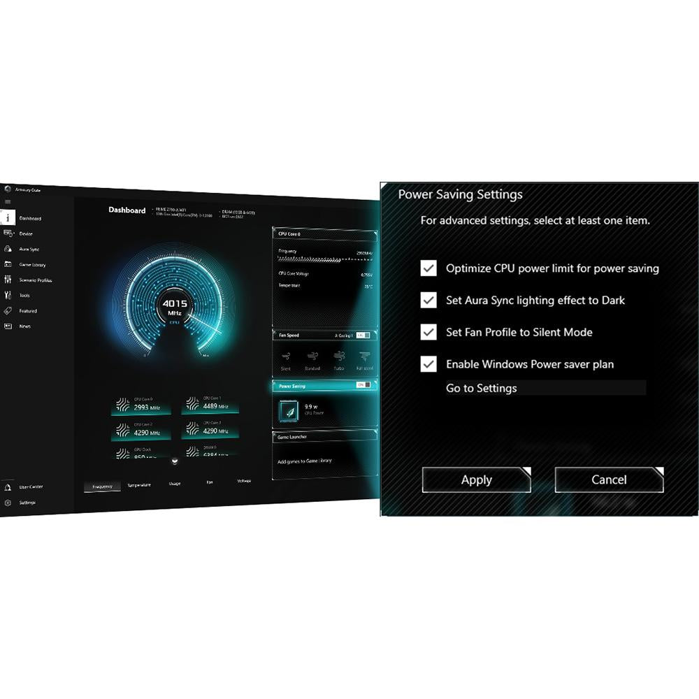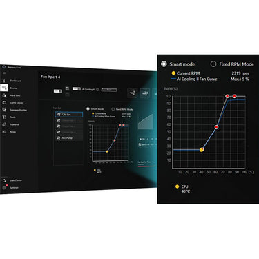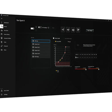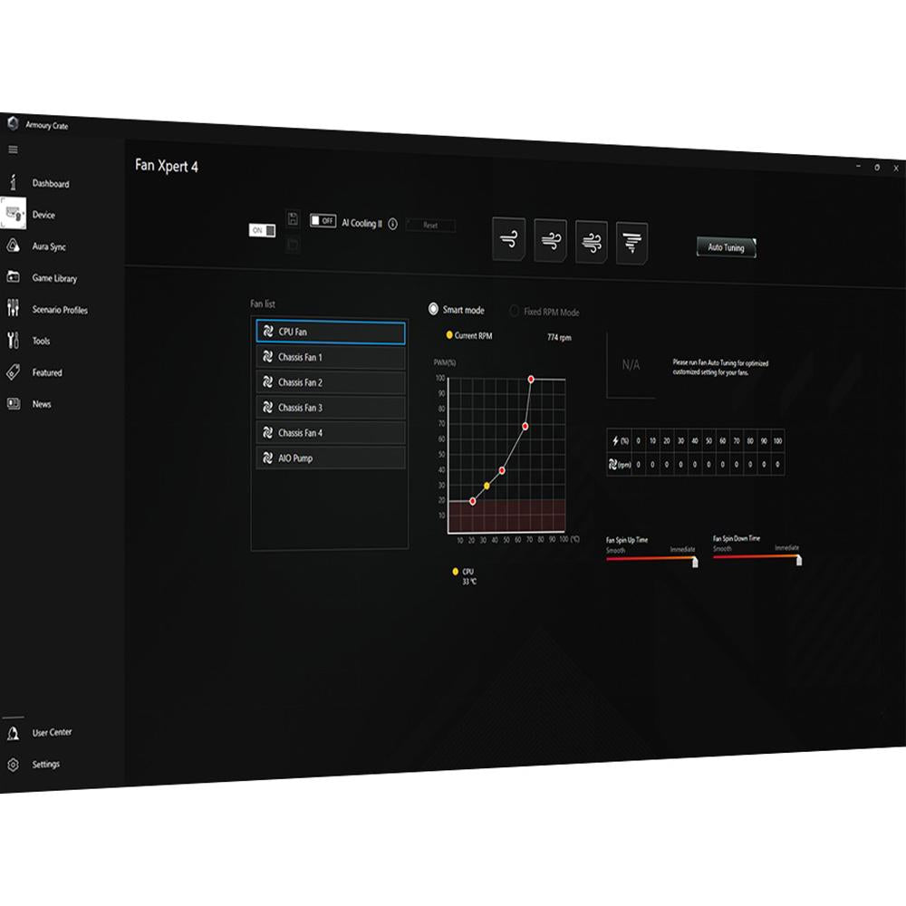 AI Cooling II balances the thermals and acoustics of any build with a single click. A proprietary ASUS algorithm slashes unnecessary noise while running a quick stress test; and then it monitors CPU temperatures to dynamically adjust fans to optimal speeds.
