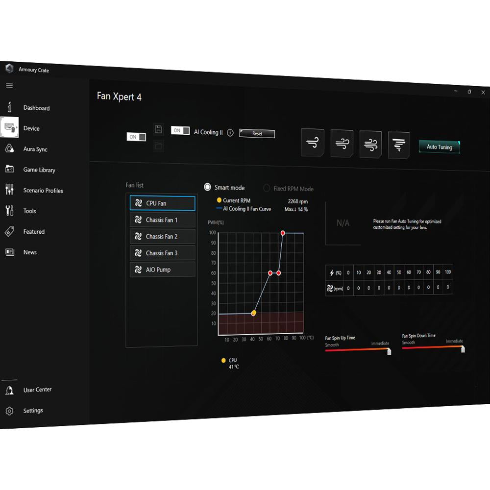 AI Cooling II balances the thermals and acoustics of any build with a single click. A proprietary ASUS algorithm slashes unnecessary noise while running a quick stress test; and then it monitors CPU temperatures to dynamically adjust fans to optimal speeds.