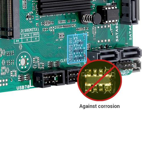 Anti-moisture Coating: An innovative moisture-resistant coating protects the motherboard in humid environments; such as factories; libraries; data centers and internet cafes. It also minimizes internal corrosion by preventing adhesion and migration of moisture; prolonging the life of the motherboard.