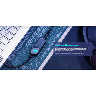 ROG Clavis works with any 4-pole 3.5 mm headset that includes a microphone. For best results; pair your laptop with headphones featuring a unidirectional microphone.