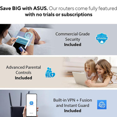 - ASUS RT-AXE7800 Tri-band WiFi 6E (802.11ax) Router, 6GHz Band, ASUS Safe Browsing, Upgraded Network Security, Instant Guard, Built-in VPN Features, Free Parental Controls, 2.5G Port, AiMesh Support
