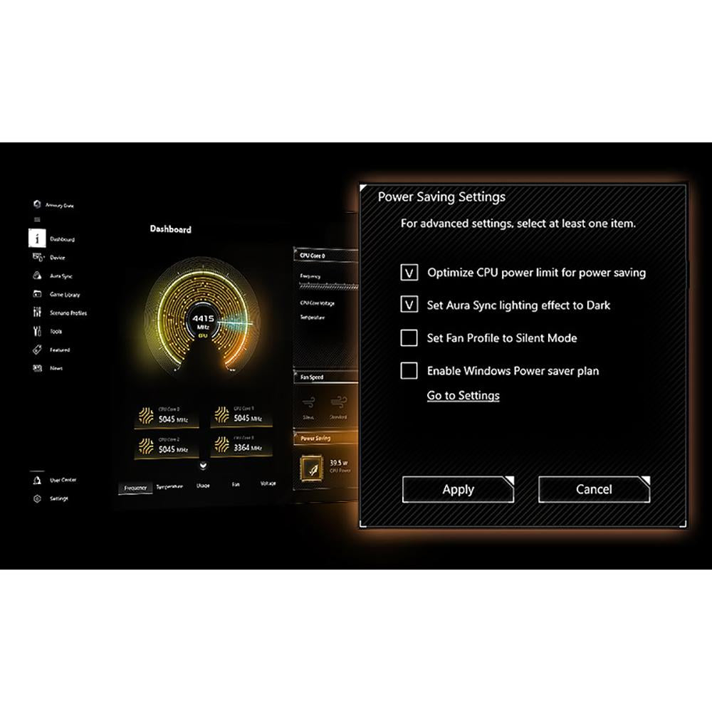 The Power Saving function contains several settings that can easily optimize power consumption and maximize energy savings. You can enable a CPU power limit, darken Aura lighting, and set the fan profile to a power saving mode. You can also toggle the Power Saver plan that is built into Microsoft Windows.