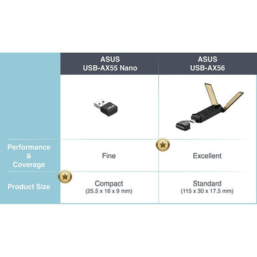- ASUS AX1800 Dual Band WiFi 6 USB Adapter, WiFi 6, 802.11ax, WPA3 Network Security, 5GHz frequency band, Compact size (USB-AX55 Nano)