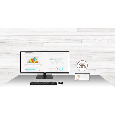 ASUS VP349CGL Ultra-wide Business monitor features 34-inch with an ultra-wide 21:9 ratio and 3440 x 1440 resolution; delivers a 33% larger display area compared to a Full HD monitor for the best productive multitasking. USB-C port supports video transmission in DisplayPort signal and 15W power output for your devices via only one USB-C cable.