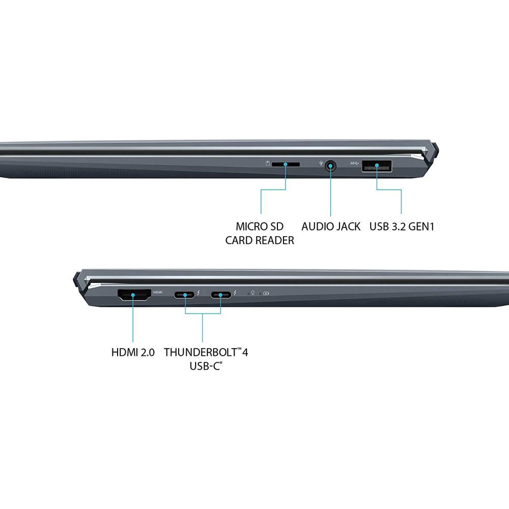ZenBook 14 is an ultrathin laptop that features a full complement of I/O ports, with two Thunderbolt 4 USB-C ports that support fast charging.