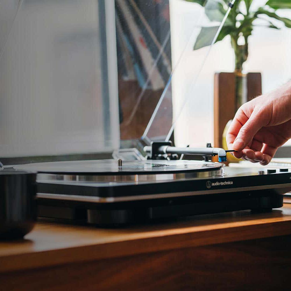 With its integrated AT-VM95C cartridge the turntable’s J-shaped tonearm requires no additional setup, such as balancing or cartridge installation. Simply select the speed you want (33⅓ or 45 RPM) then press the Start and Stop buttons to control automatic operation or use the tonearm lift lever to play specific tracks on a record.