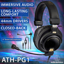 Designed with the serious gamer in mind, the ATH-PG1 gaming headset delivers wonderfully immersive audio and long-lasting comfort that puts you in the game and lets you stay there as long as you want. Large 44 mm drivers provide powerful, lively sound specially tuned to accentuate all the sonic detail of the gaming environment. The closed-back headset is constructed of lightweight materials and features soft leather headband and earpads, allowing you to play on without fatigue. The ATH-PG1 also comes equipped with a flexible, 6" boom microphone for crystal-clear in-game voice communication with other gamers. This mic, with 1.2 m cable and in-line volume and mute control, can be detached and replaced with a 1.2 m smartphone cable, which includes its own mic and portable-device controller. An additional 2.0 m extension cable terminating in two 3.5 mm mini plugs for mic and audio works with either of the 1.2 m cables to provide increased flexibility when gaming on a computer. The 1.2 m smartphone cable lets you transform this gaming headset into any everyday pair of on-the-go headphones, perfect for answering calls and controlling audio and video on smartphones and other portable devices.