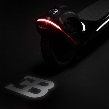 Recognizing safety as a first and foremost concern, the Bugatti electric scooter is equipped with cutting-edge technologies to ensure driver protection. For those purposes, this electric scooter features unique lighting functions. Its dual-turn signals are located on the ergonomic handle grips, as well as above the rear mudguard.