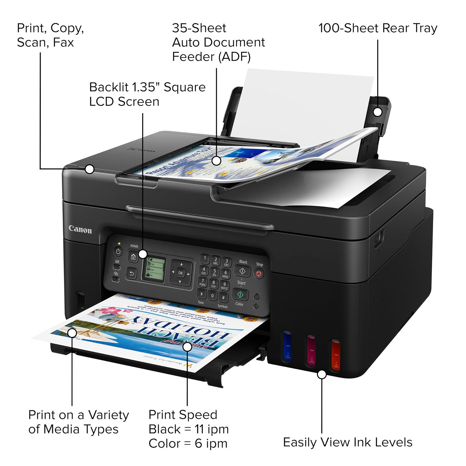 Meet the Canon MegaTank G4270 All-in-One Wireless Supertank Printer—built to slash ink costs and keep your home or small office moving. With refillable MegaTank bottles, you can print up to 6,000 black / 7,700 color pages from a single set, saving up to $1,000 on ink. The G4270 handles print, copy, scan, and fax and adds everyday conveniences like an Auto Document Feeder, wireless printing with AirPrint® and Mopria®, and a backlit 1.35" square LCD for quick navigation. A compact footprint, 100-sheet rear tray, and support for varied media—including envelopes, glossy photo paper, and banners up to 8.5" × 47"—make it a versatile fit for busy desks. With fast speeds up to 11 ipm black / 6 ipm color, user-replaceable maintenance parts, and a monthly duty cycle up to 3,000 pages, the G4270 is engineered for reliable, low-cost productivity.