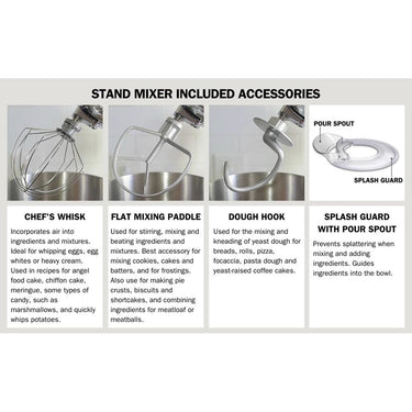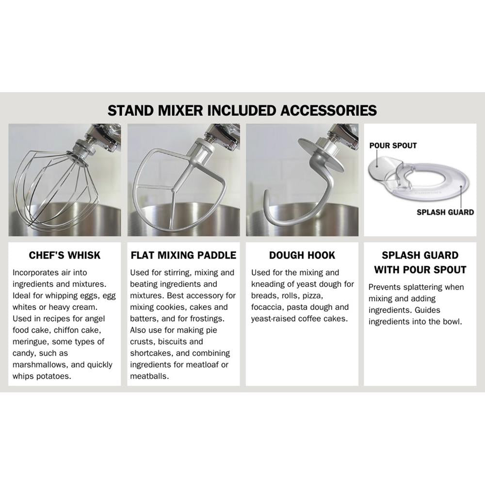 Includes chef's whisk, dough hook, flat mixing paddle, and splash guard with pour spout