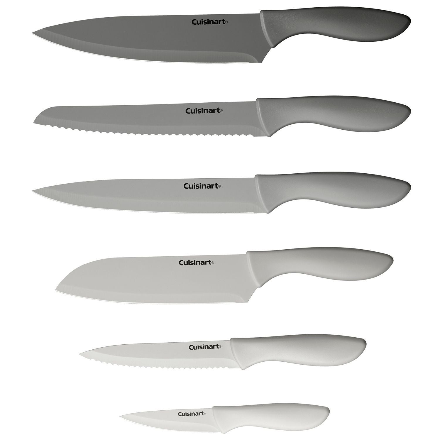 Cuisinart Advantage professional-quality stainless steel knives each have a cutting-edge and nonstick coating that makes slicing easier. These premium knives come with blade guards and feature ergonomic handles.