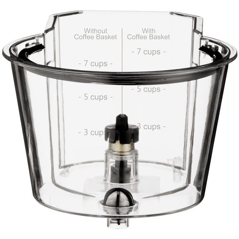 Clear brewing chamber with removable water tank and coffee filter basket for easy filling and cleaning.