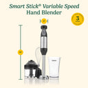 Versatile and durable, this kitchen essential provides the high performance today's home chefs demand. Equipped with a 300-watt DC motor that delivers maximum power with minimum noise, the Smart Stick® Variable Speed Hand Blender switches from low to high speed at the turn of a dial. The long stainless steel shaft reaches deep to blend in bowls, pots and pitchers, while the mixing/measuring cup, chopper/grinder and chef's whisk make short work of a wide variety of food prep tasks. From puréeing soup to emulsifying mayonnaise to whipping meringues, this hand blender consistently delivers chef-caliber results.