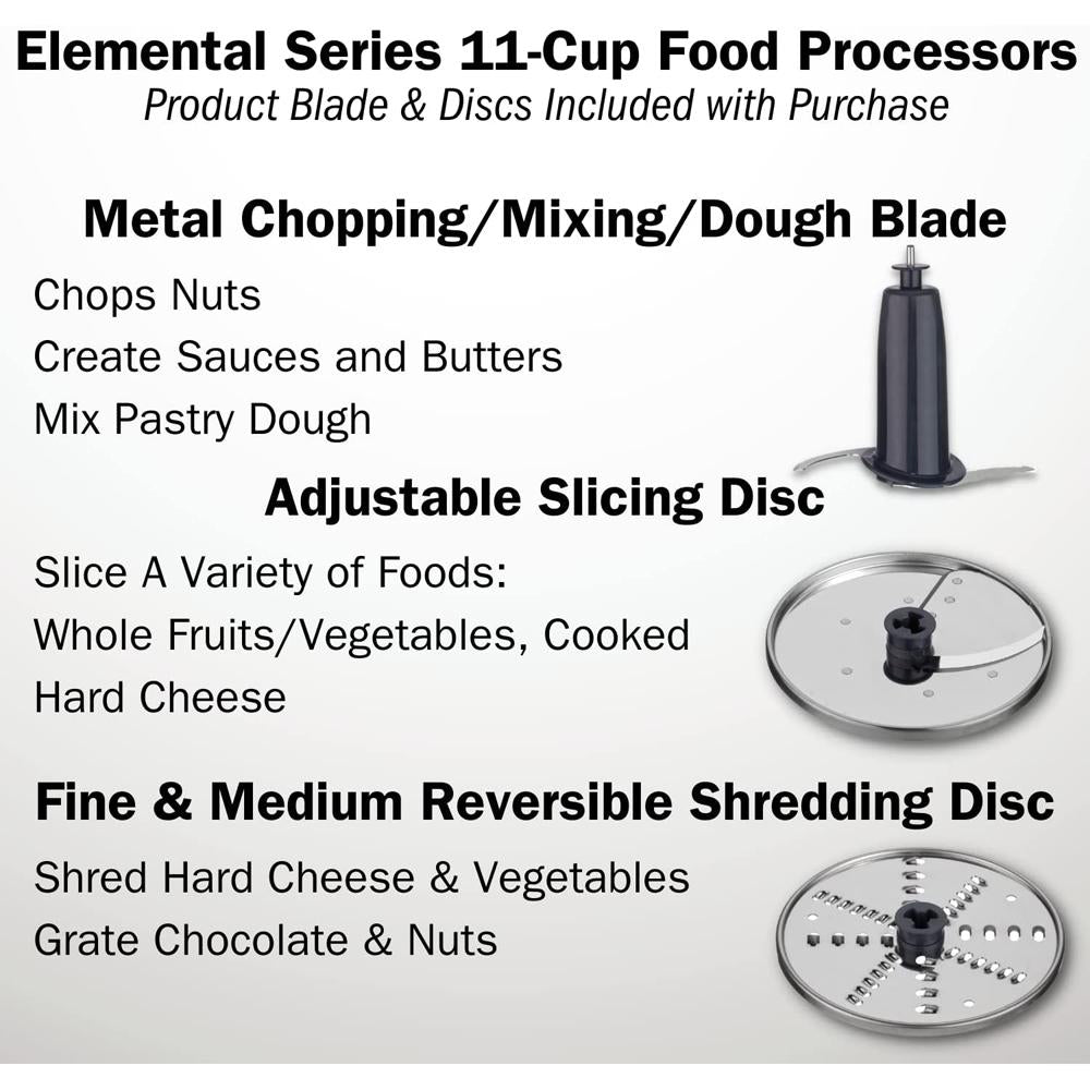 The Cuisinart Elemental 11 Cup Food Processor lets you quickly and easily prepare large portions of ingredients for meals with minimum effort. The generous 11 cup work bowl, make this food processor the ultimate timesaver for your favorite dishes, making quick work of everything from chopping nuts and pureeing soup to slicing tomatoes and shredding cheese. Another time saver - the rubberized touchpad with Pulse control is wipe-clean and the removable parts are dishwasher safe!