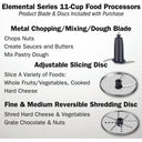 - INCLUDED: Adjustable slicing disc, stainless steel chopping/mixing blade including dough blade with small and large S-blades, stainless steel reversible shredding disc (fine/medium) and stainless steel adjustable slicing disc (0-7mm)