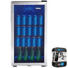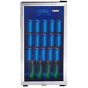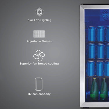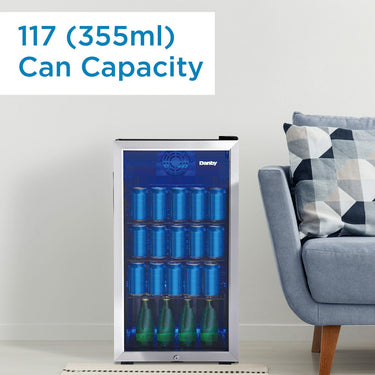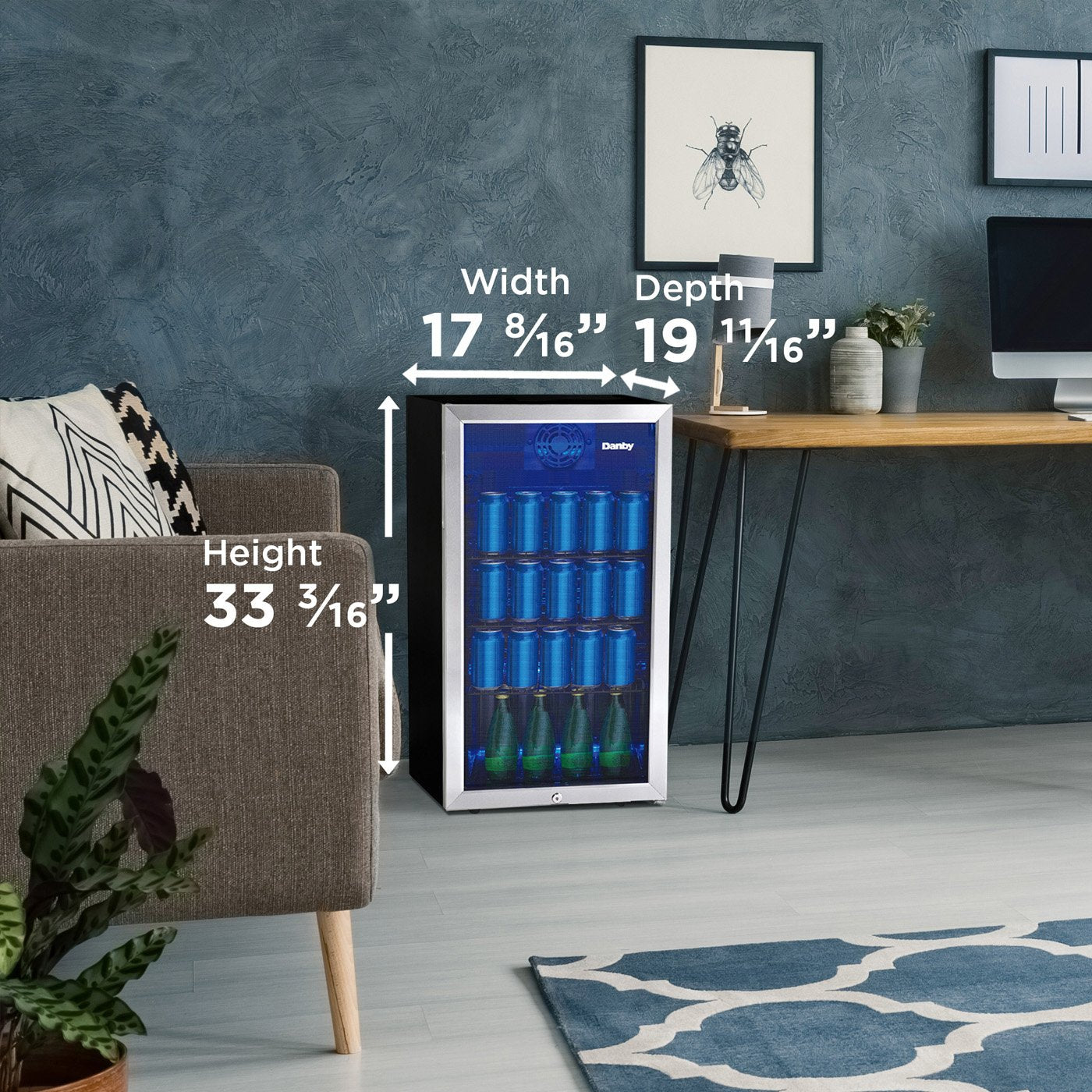 This Danby freestanding beverage fridge is a compact, modern unit that can be used for storing beer, pop, and other drinks with a maximum capacity of 117 cans. It features adjustable wired shelves, blue LED lights, and a reversible door hinge for easy installation. The unit has a temperature range of 35.6F to 50F and is designed to blend with any decor style.