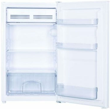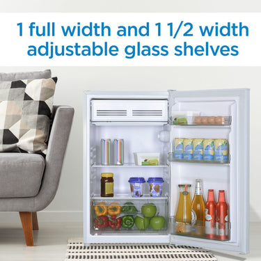 This compact fridge offers a considerable 4.4 cubic feet (125 L) of refrigeration space with a built-in full width chiller and crisper. There’s a reversible door hinge, which enables users to open the fridge left or right-handed via the integrated door handle, for any room set-up. The one-and-a-half adjustable shelves and tall bottle storage allow you to best maximize your fridge space.