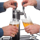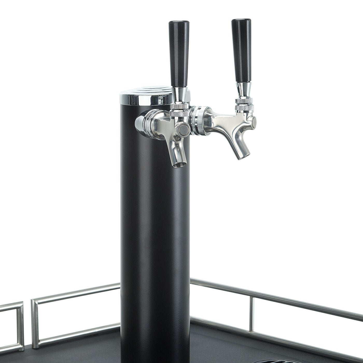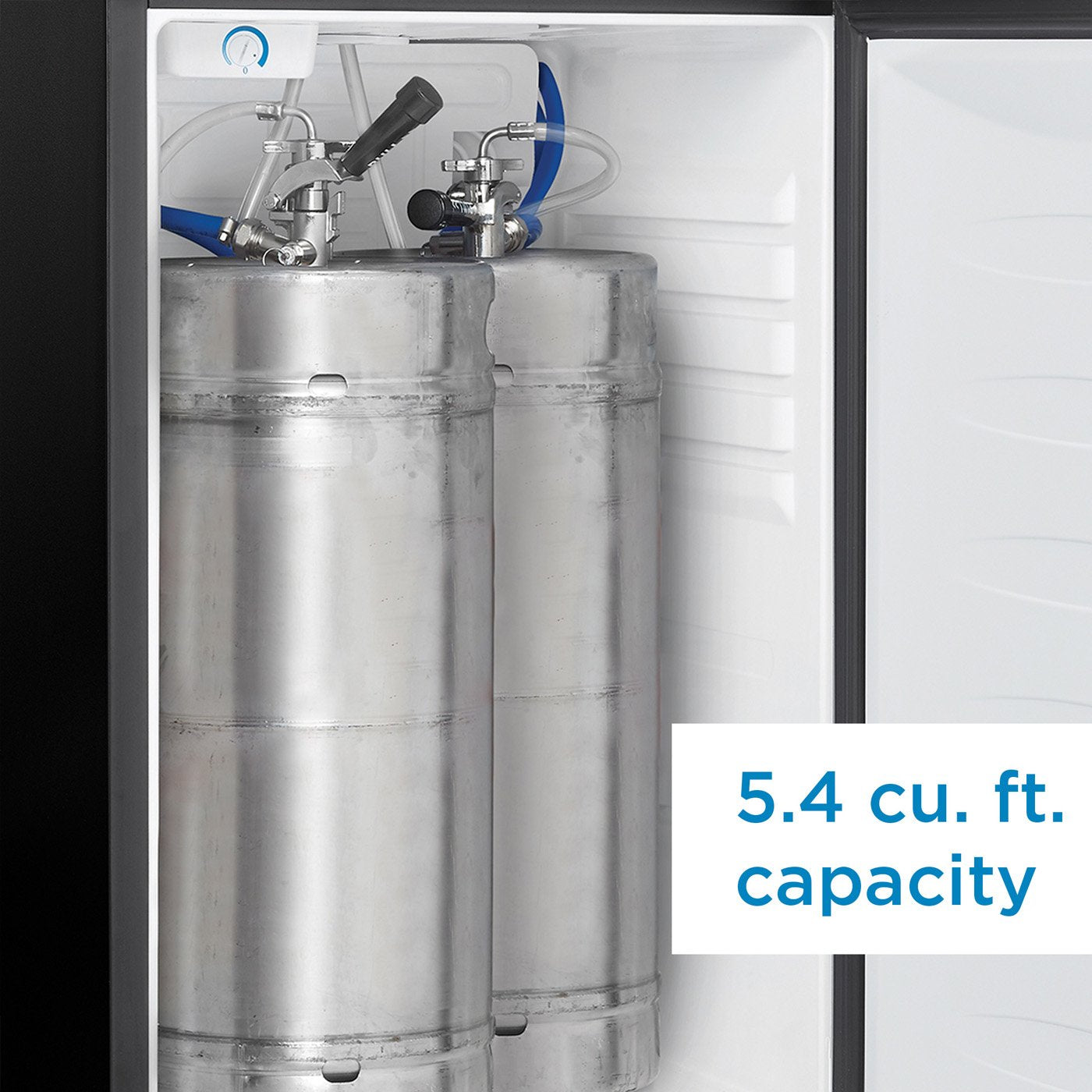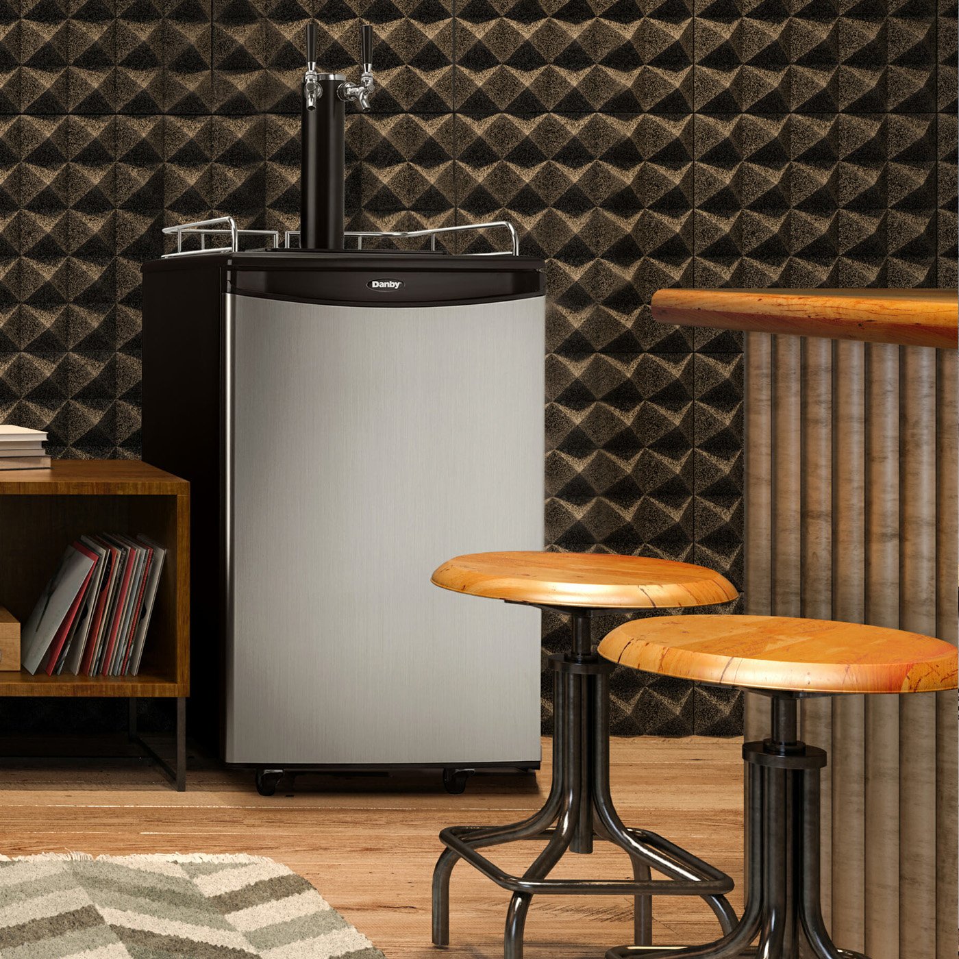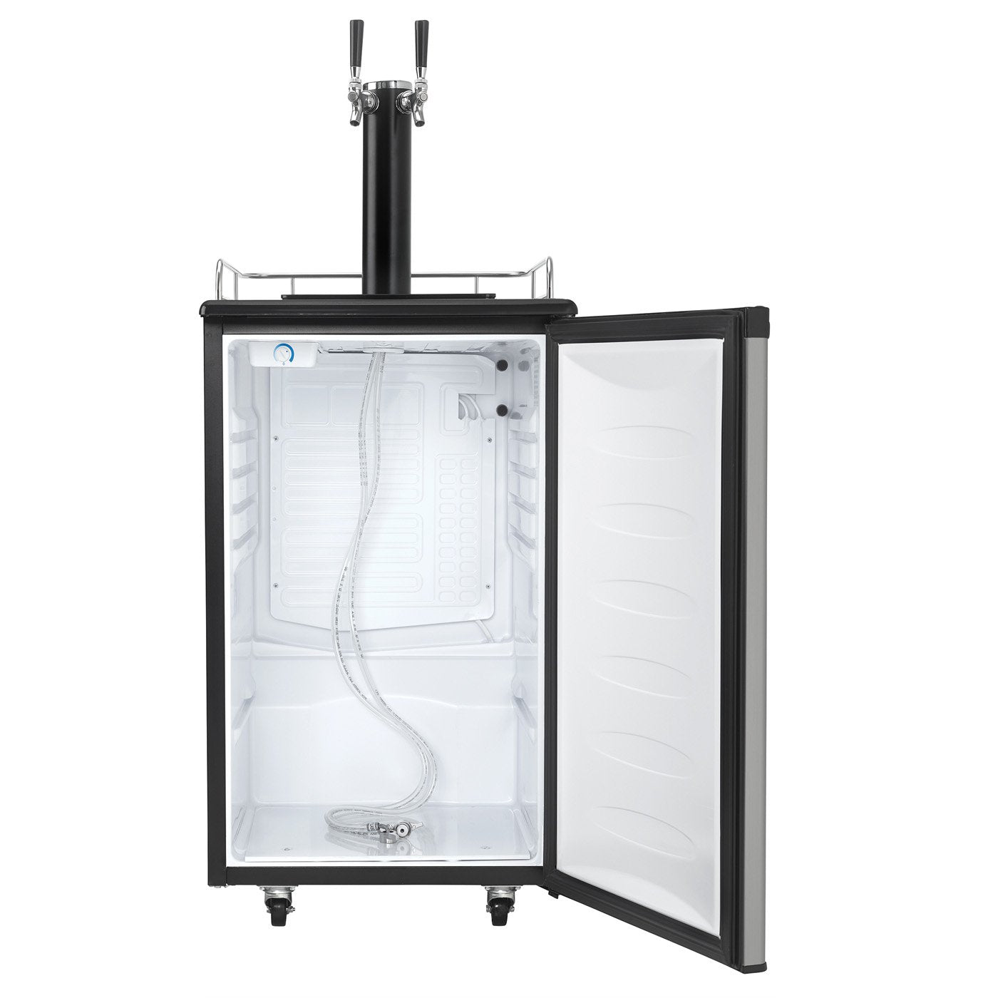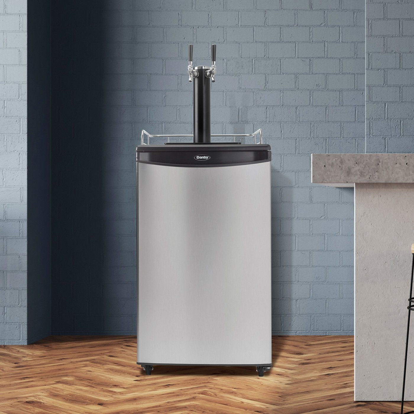 Danby Appliances' indoor freestanding kegerator is an excellent choice for beer drinkers and entertainers. It offers two cold beers on tap at once, using environmentally friendly R600A refrigerant and an automatic-defrosting system. The unit includes a single gauge regulator, CO2 tank, and hardware, with a mechanical-thermostat, stainless-steel finish, and a scratch-resistant worktop.