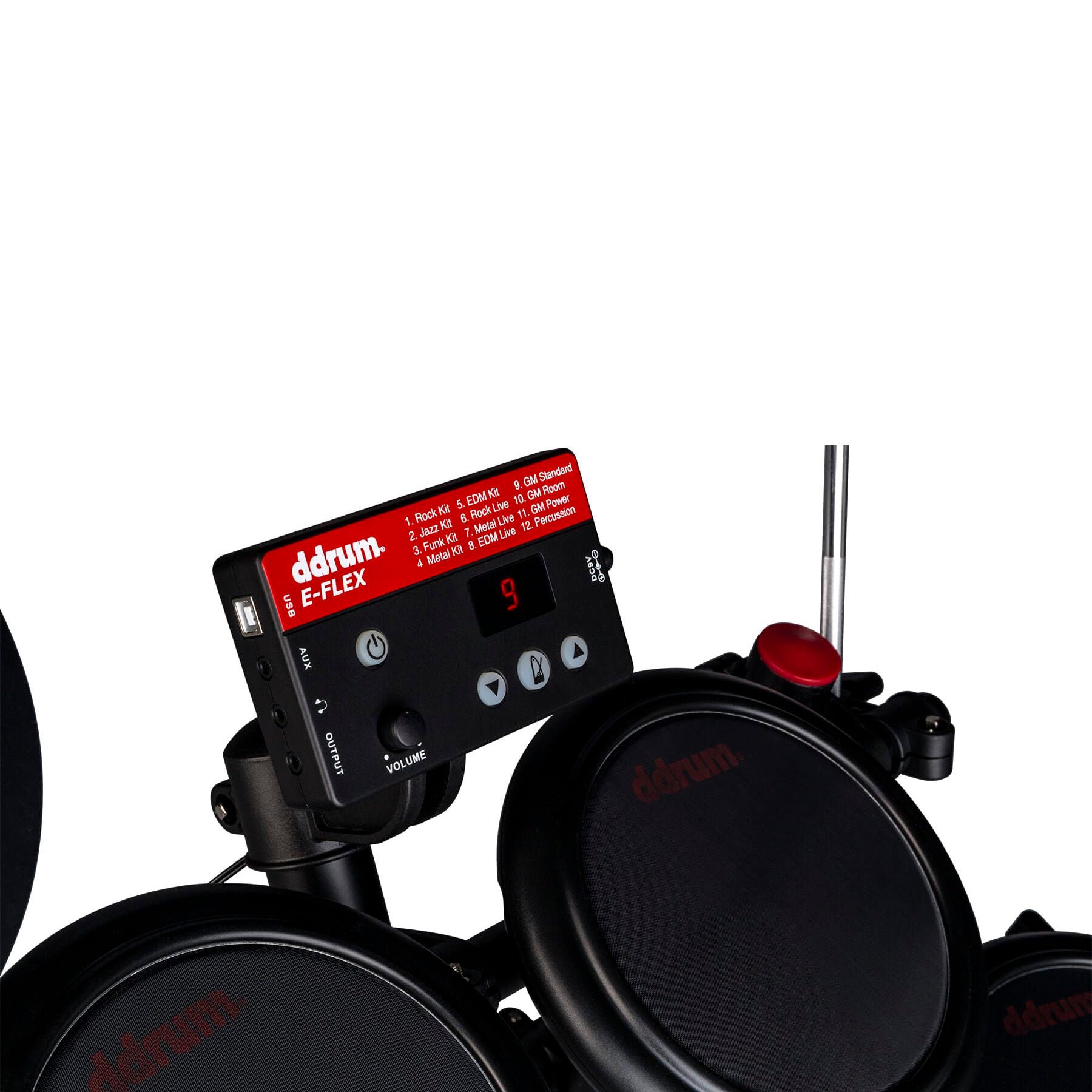 For 2022, ddrum introduces a new electronic drum kit that is great for beginners as well as any drummer looking for a simple and quiet practice solution. The ddrum E-Flex has great feeling and responsive mesh heads on all 3 toms and the 2-zone snare pad. Both the hi-hat and bass drum controller pedals were designed to feel and respond naturally while keeping the set-up simple. The E-Flex also features a Double Bass Mode, allowing a player to use the hi-hat controller as a second bass drum. The all new ddrum E-Flex electronic drum set is a complete all-in-one solution for a beginning drummer, or any drummer looking for a quiet practice kit with a small footprint.