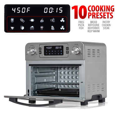 Simply press and select one of 10 pre-set cooking modes to start cooking. Use these settings for fantastic French Fries, Pizza, Bread, Cake, Chicken, Steak, Rotisserie, Fish, Dehydration, and Keep Warm. The ovenās digital interface and dial combo make setting your air frying oven quick and painless.