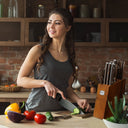 Proudly display your knife set on the counter for easy access and organization. Each knife has a home in a solid acacia pinewood block using precisely sized slots that fits each type of knife. Practical, beautiful, and keeps your knives safe. Additionally, you'll get a bamboo cutting board that's more resistant to cuts and bacteria.