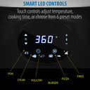 With an easy to use LED touch control panel, control temperature, cooking time, and choose from 6 different preset cooking modes ā these include Fish, Steak, Chicken, Hamburgers, Homemade Fries, and Frozen Fries.