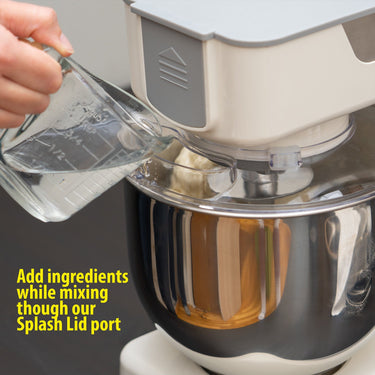 Mix in large quantities using the included 5.5-quart stainless steel bowl. Sturdy, easy-to-clean, and beautifully finished, mix flours, eggs, cookie, bread doughs, and more. The included clear splash guard keeps mess to a minimum.