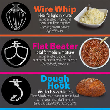We include essential mixing accessories, each with their own helpful uses - dough hook, flat beater, and wire whip. These are easily detached and swapped while also easy to clean by hand using warm water. Die-cast aluminum attachments and mixing bowl should not be cleaned in a dishwasher or using strong detergents - this can cause oxidation of the components. We also include a 1-Year Limited Manufacturer Warranty.