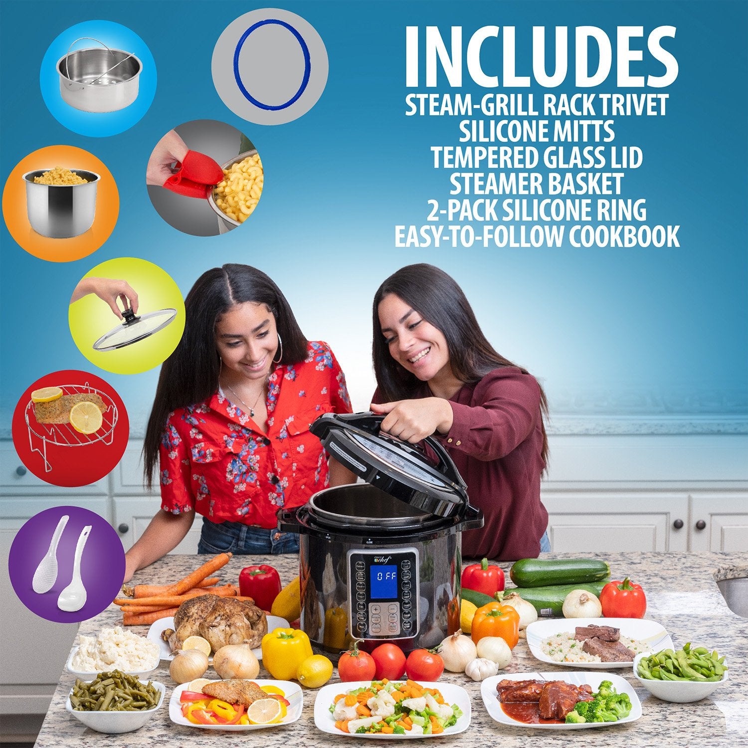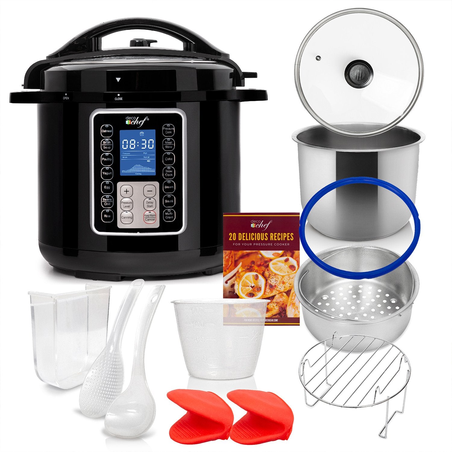 Included are a variety of helpful accessories – you get a Deco Chef Recipe Book, 2-Pack Silicone Sealing Ring Set, Silicone Mini Mitts, Stainless Steel Steamer/Grill Rack, Tempered Glass Pressure Cooker Lid, Steamer Basket. Everything you need to make healthier, faster meals and take back dinner time.