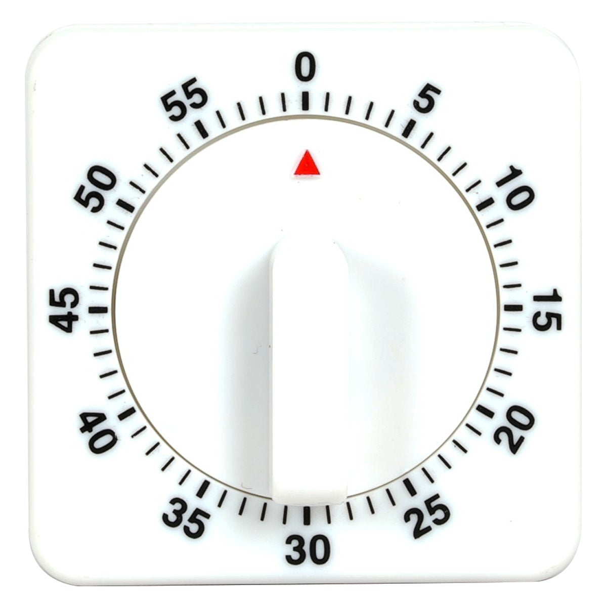 Easily set the time needed from 1-60 minutes and it will accurately countdown to zero. Each white timer is mechanical, meaning no batteries are needed. Stand your timer upright on the counter, stove, or lay on its back on top of any flat surface.