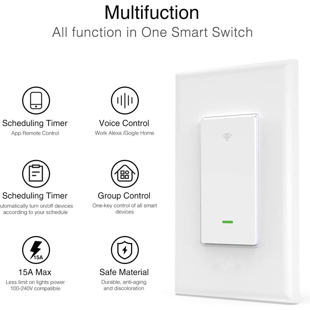 Control various types of light bulbs and fans. App supports setting smart single-pole switches in the same group, which is convenient to turn on/off your devices uniformly. Set a schedule turn off or turn on smart switch automatically.