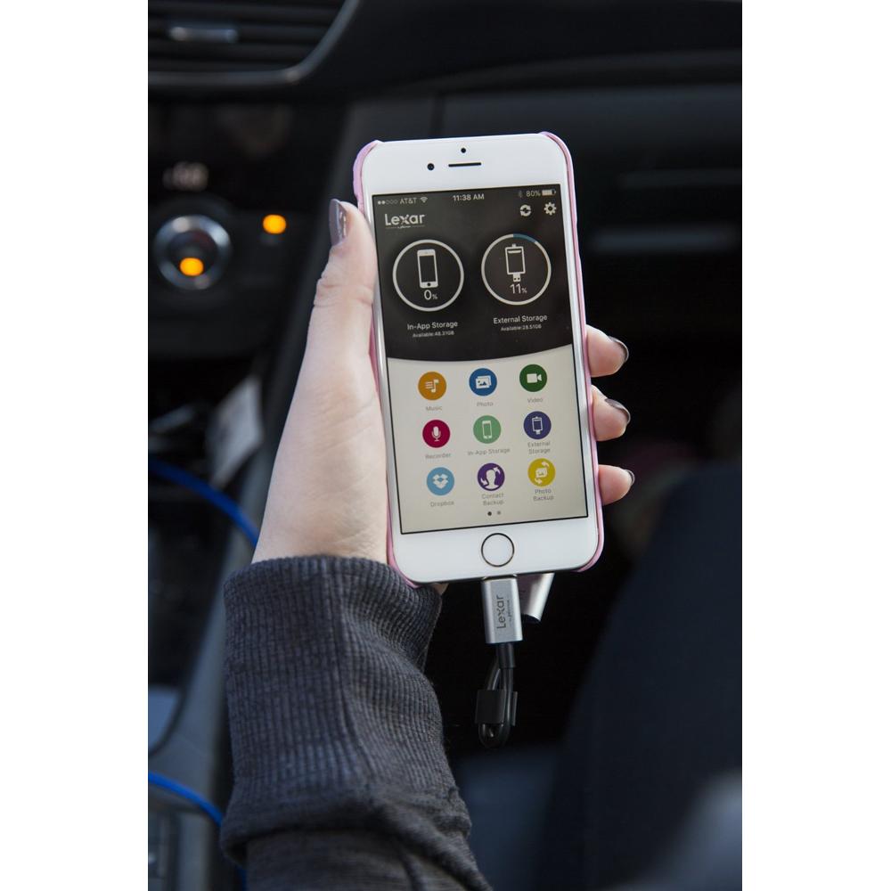 JumpDrive C20i works with use of a free file management app on the App Store. The app also allows you to back up files when connected. And with capacities from 16GB to 128GB, you can offload lots of content from your devices to create room for even more.