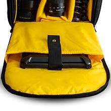 Other compartments include a padded laptop or tablet sleeve, two side storage pockets, one large quick-access outer storage pocket, and a loop for storing and securing a tripod. A hard plastic grab handle can be found on the base of the case ā this doubles as a base when sitting your camera bag vertically as well as a grab handle when lugging around your bag with two hands.