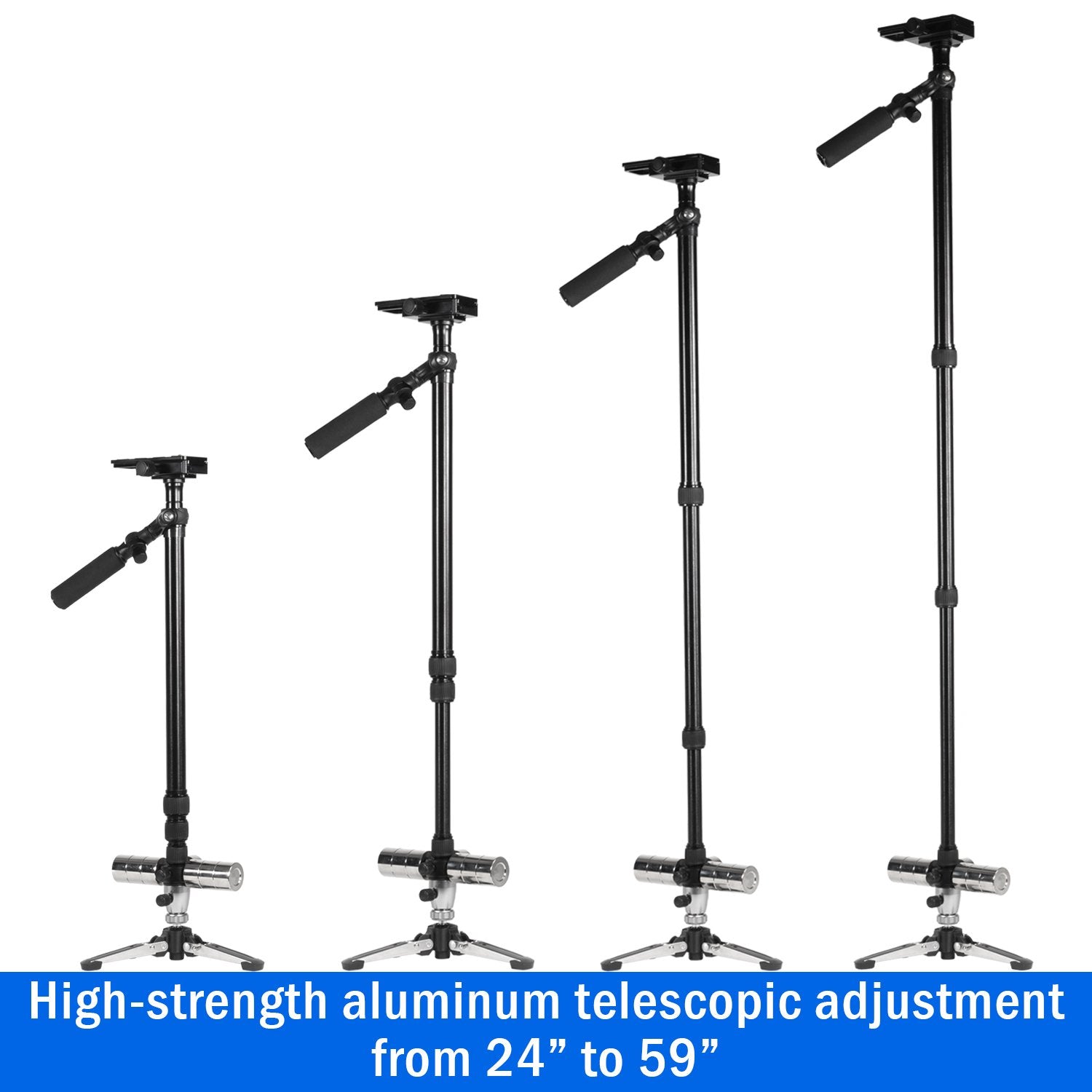 This stabilizer can be used with cameras and camcorders that have a standard tripod socket. It extends up to 59 inches, and can fold to 24 inches. The included carrying case allows for easy transport.
