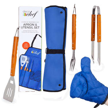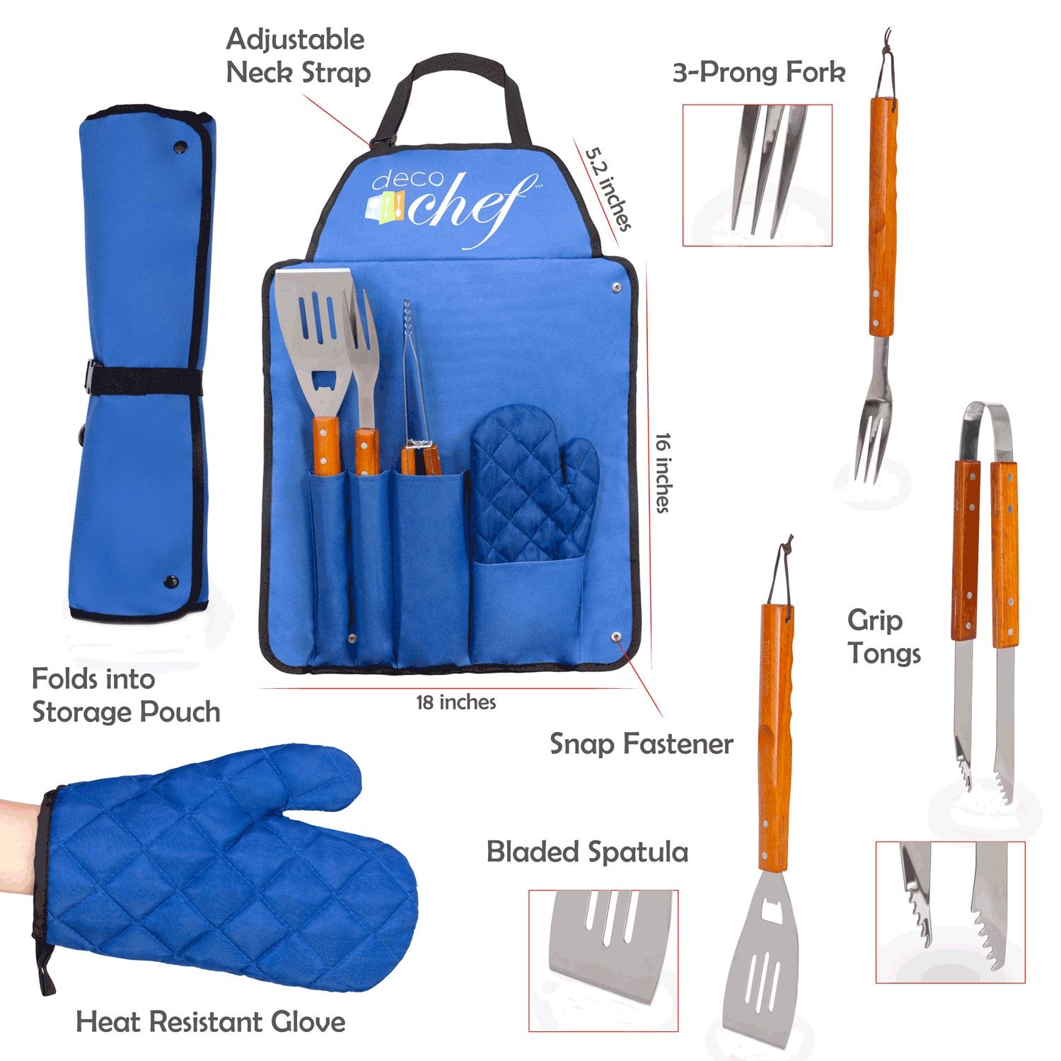 Deco Gear 5 Piece BBQ Tool Set with Custom Blue Apron, Spatula, Tongs, Fork and Oven Mitt