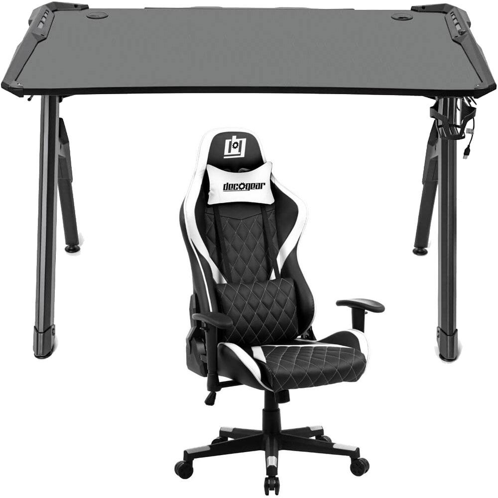 Deco Gear 47" LED Gaming Desk, Carbon Fiber Surface with Gaming Chair (White) Bundle