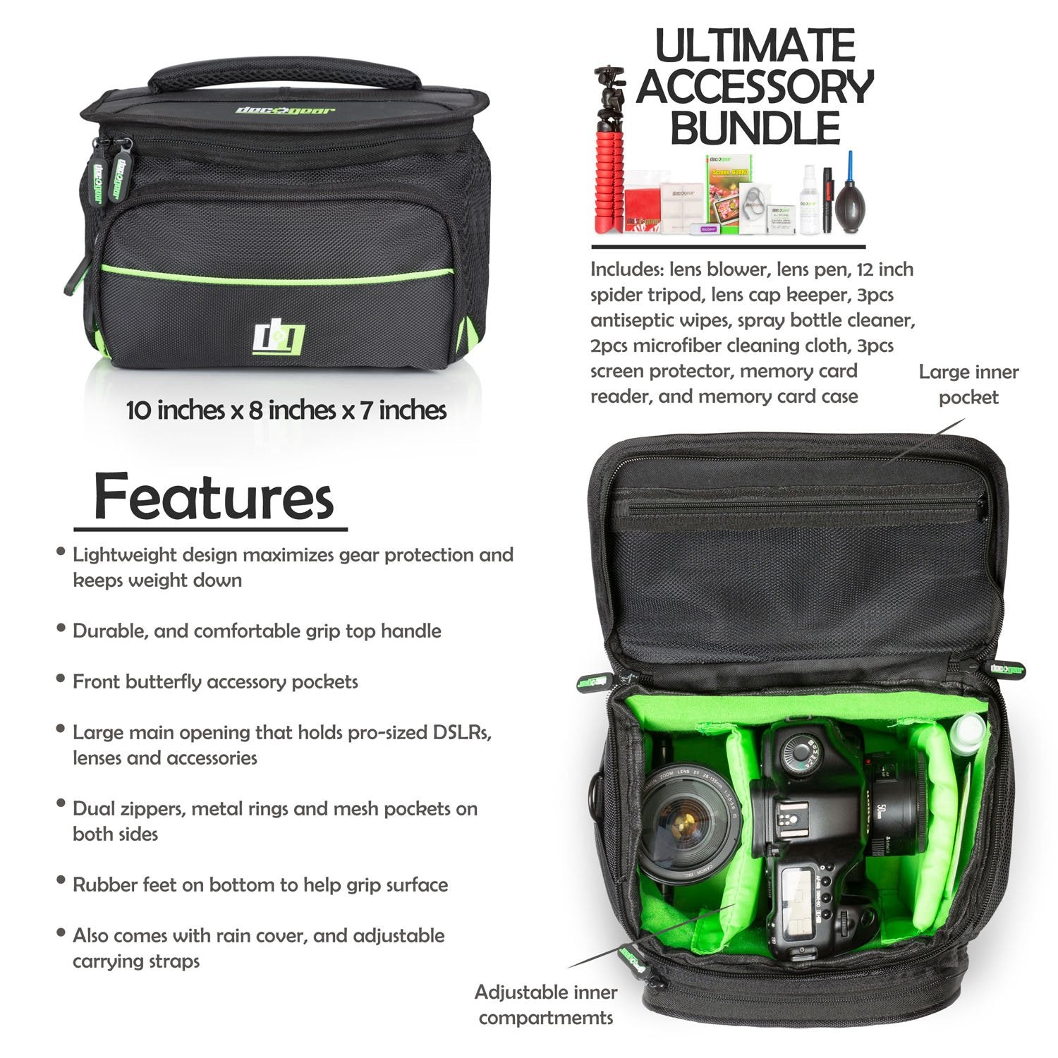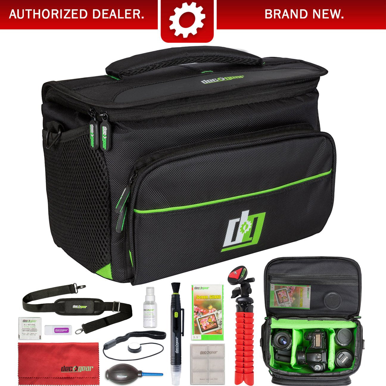 Equipment can be expensive, don't let it get ruined because it wasn't protected! Check out our Deco Gear stylish camera protection bag (DGCAMBAGMED). Made with lightweight materials to keep weight down and maximize your gear protection. The main opening is large enough to hold pro-sized DSLRs, lenses or accessories. Including a comfortable grip top handle, front butterfly accessory pockets, dual zippers, metal rings, mesh pockets on both sides, adjustable carrying straps and rubber feet on bottom to help grip surfaces. Also comes with a rain cover for when the weather moves faster than you can. Included in this bundle is our camera accessories kit. Which features Lens Blower, Lens Pen, 12in. tripod, Lens Cap Keeper, 3 Piece Antiseptic Wipes, Spray Bottle Cleaner, 2 Piece Microfiber Cleaning Cloth, 3 Piece Screen Protector, and Memory Card Reader/Case. Everything you need to take care of and protect your valuable equipment!