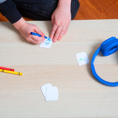 The coolest feature is the ability for you or your child to customize their headset to make it their own. Pre-printed cards are provided that can be colored with the provided crayons. Each card is inserted onto the outside of each earcup so your artist can show off their latest and greatest work.