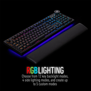 Designed with a slick RGB lighting scheme that illuminates the top of your keyboard and underneath, choose from 12 key backlight modes, 4 side lighting modes, and create up to 5 custom backlight modes.