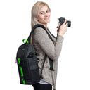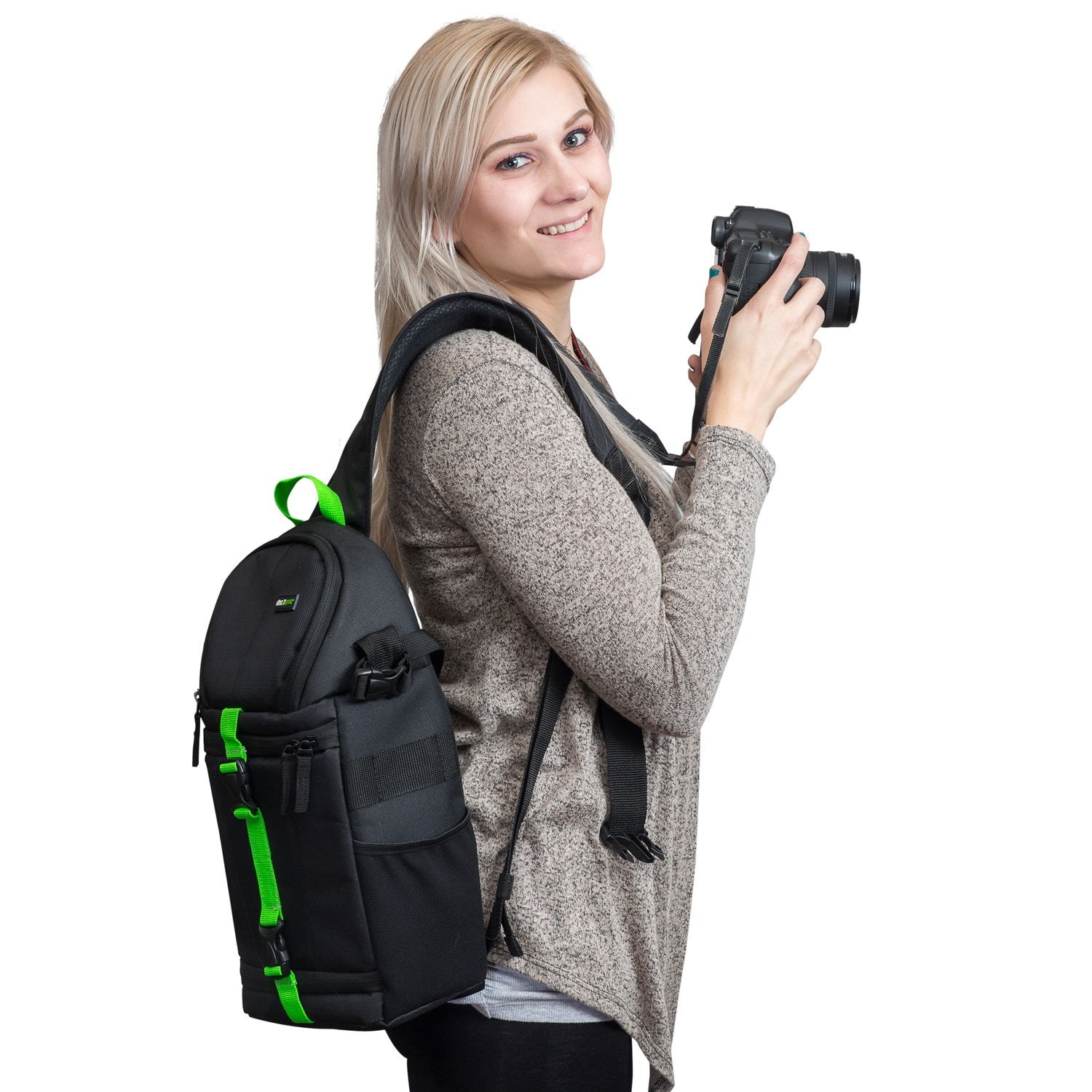 This lightweight black and green rugged over the shoulder sling bag from Deco Gear is made from weather resistant Nylon exterior and can hold a DSLR and accessories or multiple DSLR/Mirrorless cameras. Perfect for making sure you that have the best photographical equipment availaible for the task. The main compartment has customizable padded dividers and easy zipper access. This backpack can also be worn as a crossbody for better weight distribution when making those longer treks to shoot locations. With a bountiful amount of pockets there is plenty of room for your gear and additional accessories like snacks or water.