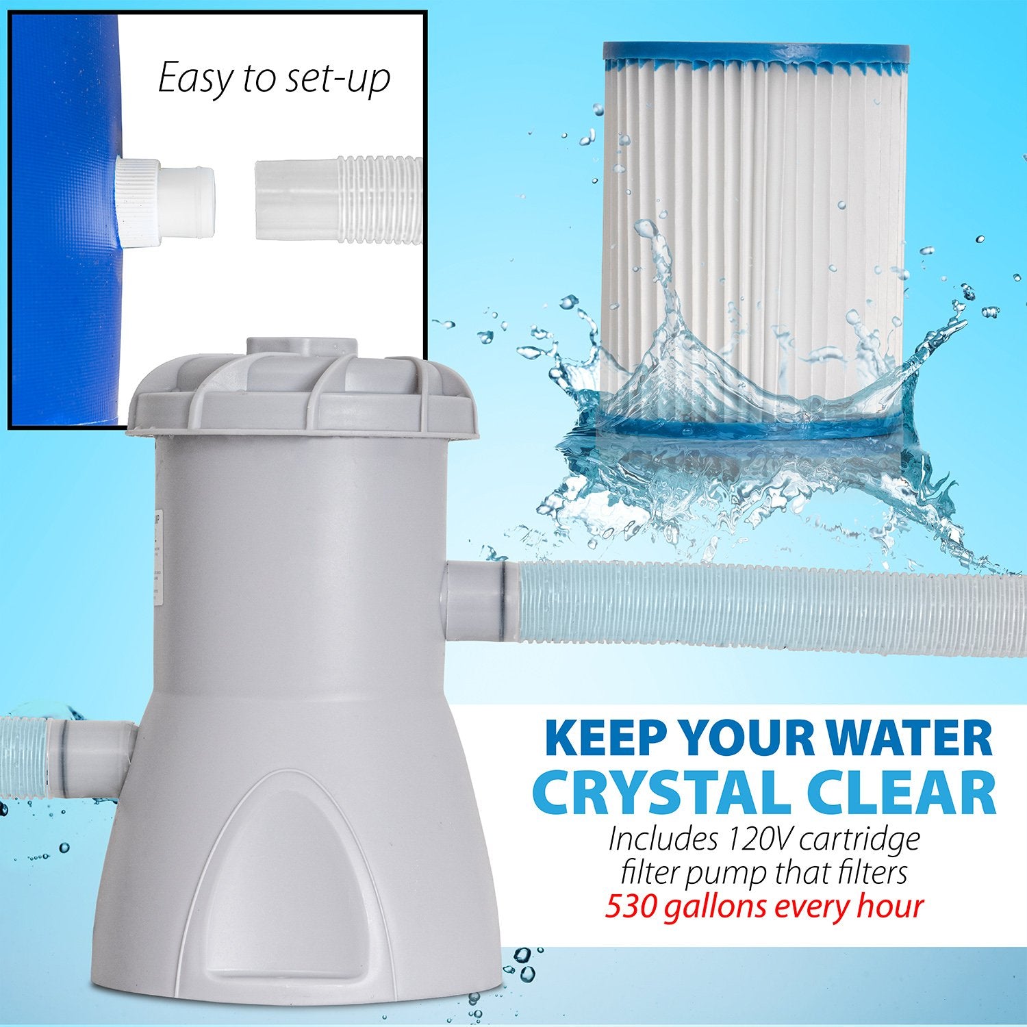 Also included is a 120-volt cartridge filter pump that filters and cleans 530 gallons of water every hour. Keep water crystal clear, free of algae, bugs, and more - spend less time cleaning and more time swimming!