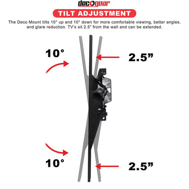 The Deco Mount 37” - 70” Tilting Wall Mount Bracket safely and securely mounts your flat panel TV. This sturdy flat-screen TV bracket supports up to 110 lb and is compatible with the VESA mounting standards of 100 x 100 and 600 x 400. It tilts 10 degrees up and 10 degrees down for more comfortable viewing, better angles, and even reducing glare.