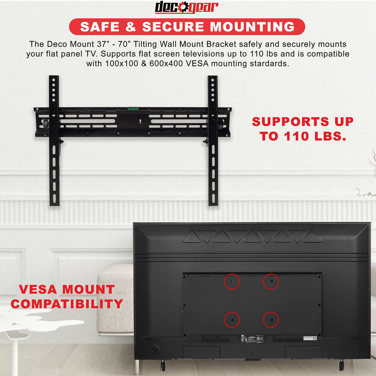 The Deco Mount 37โ - 70โ Tilting Wall Mount Bracket safely and securely mounts your flat panel TV. This sturdy flat-screen TV bracket supports up to 110 lb and is compatible with the VESA mounting standards of 100 x 100 and 600 x 400. It tilts 10 degrees up and 10 degrees down for more comfortable viewing, better angles, and even reducing glare.